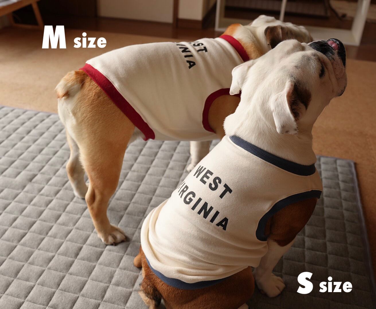 クリーム色に青のリブがアクセントになるロゴ入りタンクトップ。